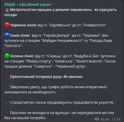 Метро работает с интервалом 1 поезд в 40 минут в одну сторону. На красной ветке поезда ходят от Шулявской до Университета.