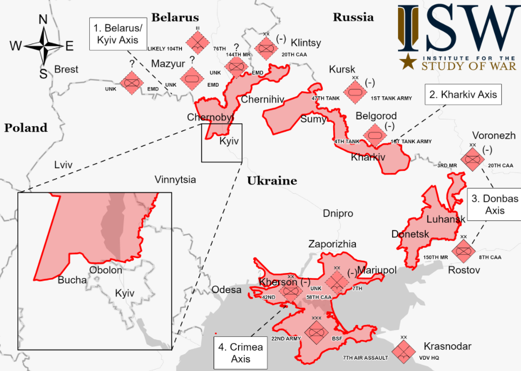 Сейчас россияне пытаются охватить Киев с запада (выйдя на Житомирскую трассу) и с востока (двигаясь к Броварам и Борисполю из Сумской и Черниговской областей).
