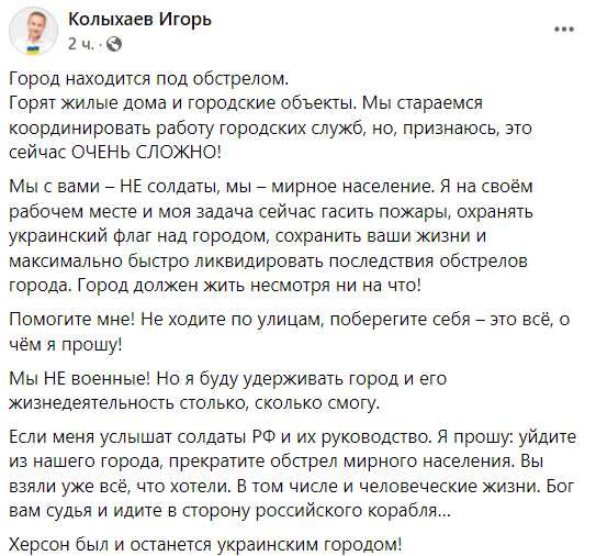 Позже мэр Игорь Колыхаев сообщил, что в городе идет бой, горят дома и есть жертвы.