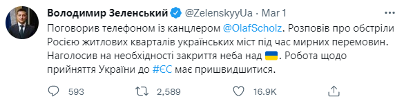 "Поговорил по телефону с канцлером Олафом Шольцом. Рассказал об обстрелах Россией жилых кварталов украинских городов во время мирных переговоров. Подчеркнул необходимость закрытия неба над Украиной. Работа по принятию Украины в ЕС должна ускориться", - написал он.