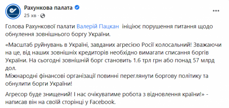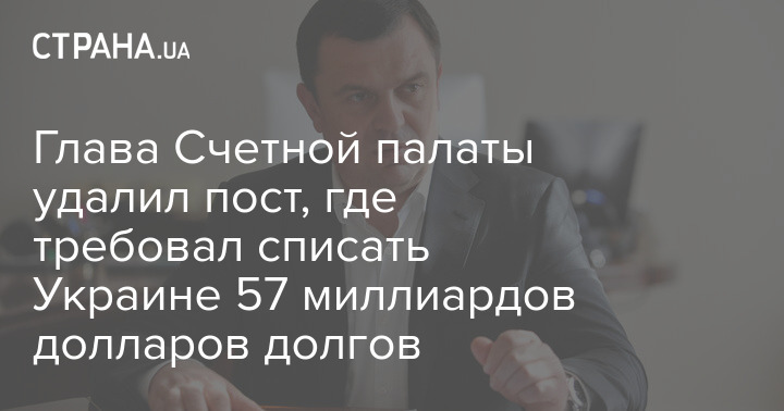 Глава Счетной палаты Валерий Пацкан удалил свой пост, где требовал у кредиторов списать Украине 57 миллиардов долларов долгов.