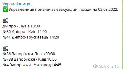 08:28 Эвакуационные поезда из Днепра и Запорожья сегодня.