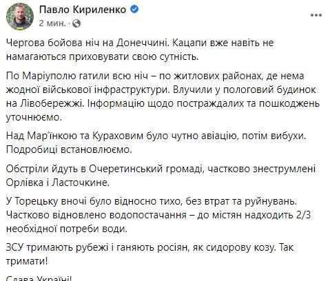 Также сообщается о начале штурма в Мариуполе, который осажден российскими войсками.