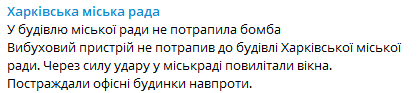 "В здание городского совета не попала бомба. Взрывное устройство не попало в здание Харьковского городского совета. Из-за силы удара в горсовете вылетели окна. Пострадали офисные дома напротив", - говорится в сообщении.