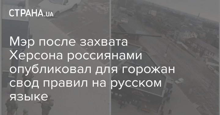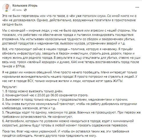 Мэр Херсона Игорь Колыхаев переговорил с представителями российской армии, которые захватили город. Он сказал, что не пошёл с ними на сотрудничество, но сделал акцент, что будет заниматься обеспечением жизнедеятельности города и теперь в нем установлены такие правила: