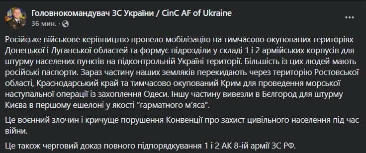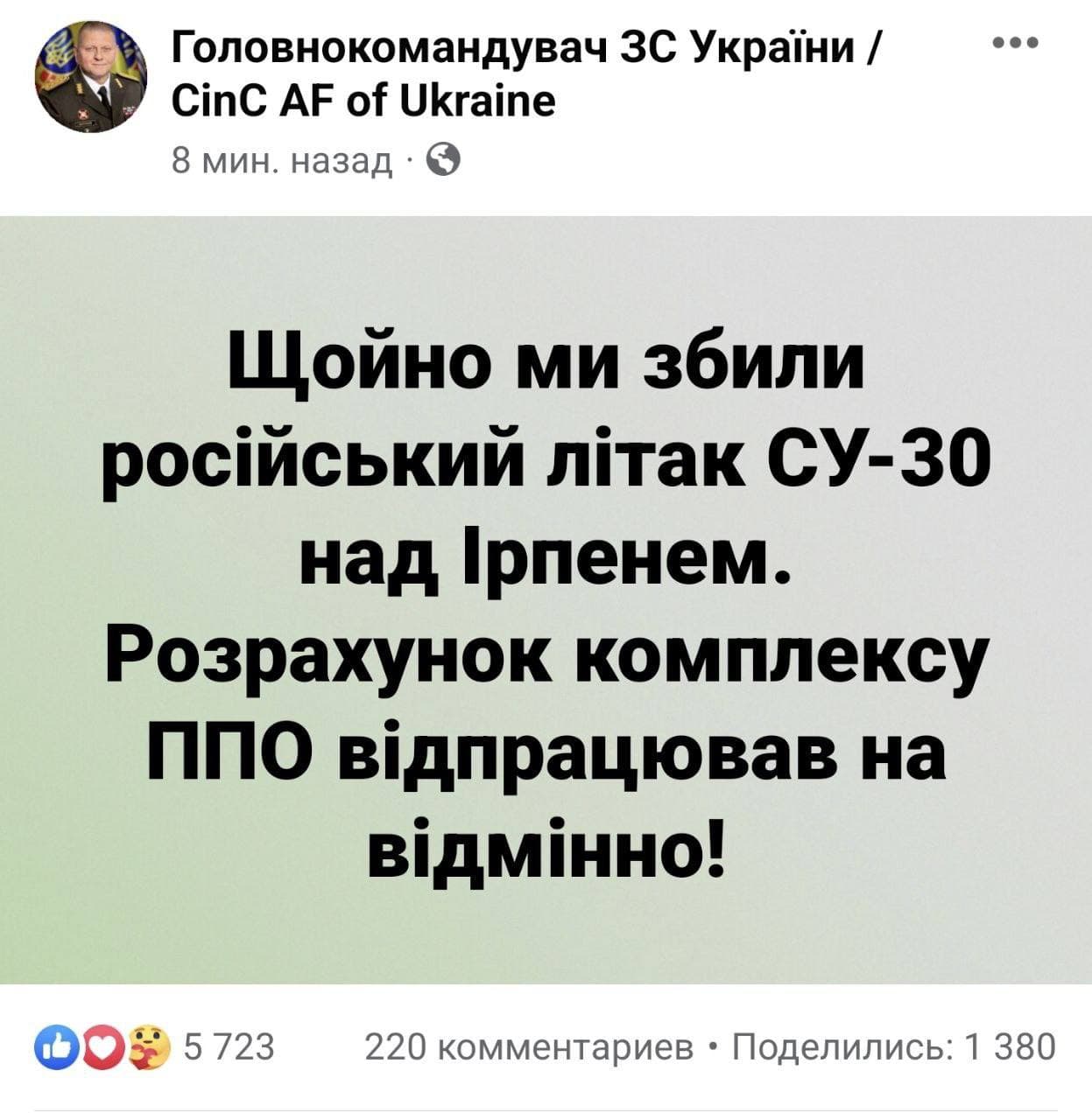 10:18 Главком ВСУ Залужный заявил о сбитом самолёте под Ирпенем.