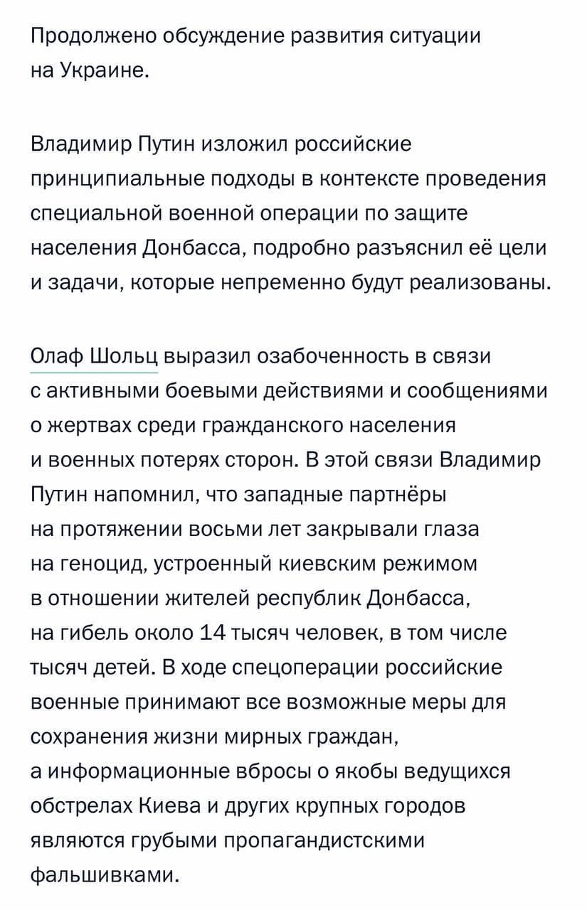 18:14 Вот полная версия Кремля по поводу переговоров Путина и Шольца.