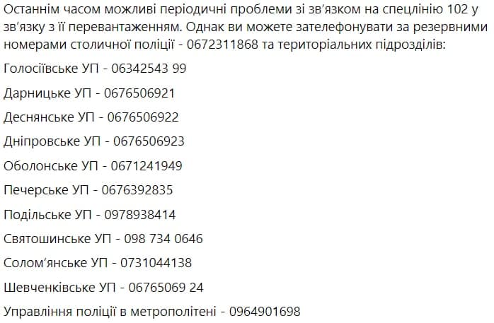 07:02 Киевская полиция публикует дополнительные номера по столичным райотделам из-за перегруженности линии 102.