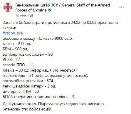 09:50 А вот сводка от Генштаба ВСУ по потерям российских войск. В ВСУ заявляют, что армия РФ уже потеряла убитыми 9000 человек.