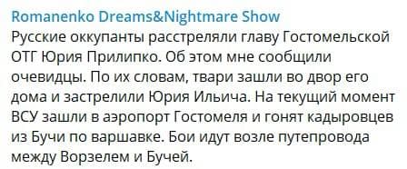 19.50 А вот сводка ГУР МО о ситуации в Гостомеле. Пишут, что город под украинским контролем сейчас.