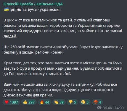"На Полесье противник приступил к инженерным работам по разграждению путей в районе Бородянки, вероятно с целью дальнейшего выдвижения в направлении Киева. Оккупационные подразделения были остановлены в районах Шибене и Катюжанка. В районе Дымера оккупант продолжает создание района обороны.