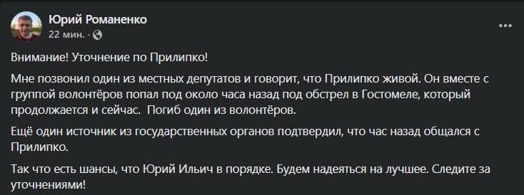 22:40 Журналист Андрей Цаплиенко сообщает, что в Гостомель вновь зашел противник - российские десантники из 31-й десантно-штурмовой бригады (Ульяновск).