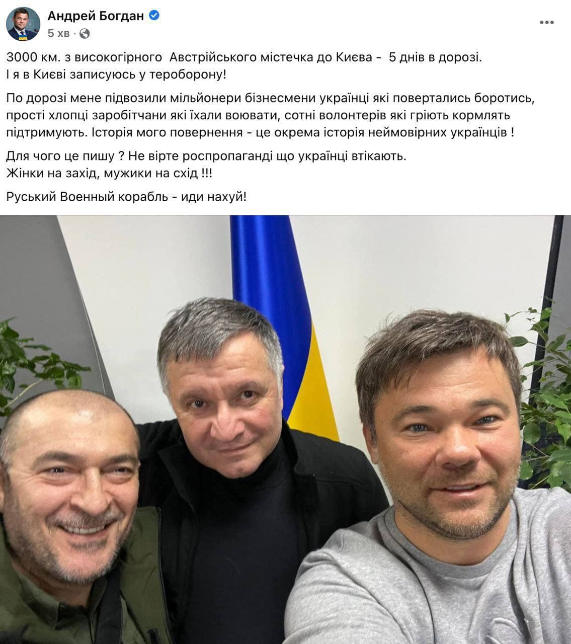 20:45 Экс-глава Офиса президента Андрей Богдан в комментарии "Стране" объяснил, почему на 8-й день войны вернулся из Австрии в Украину и вступил в ряды терообороны Киева.