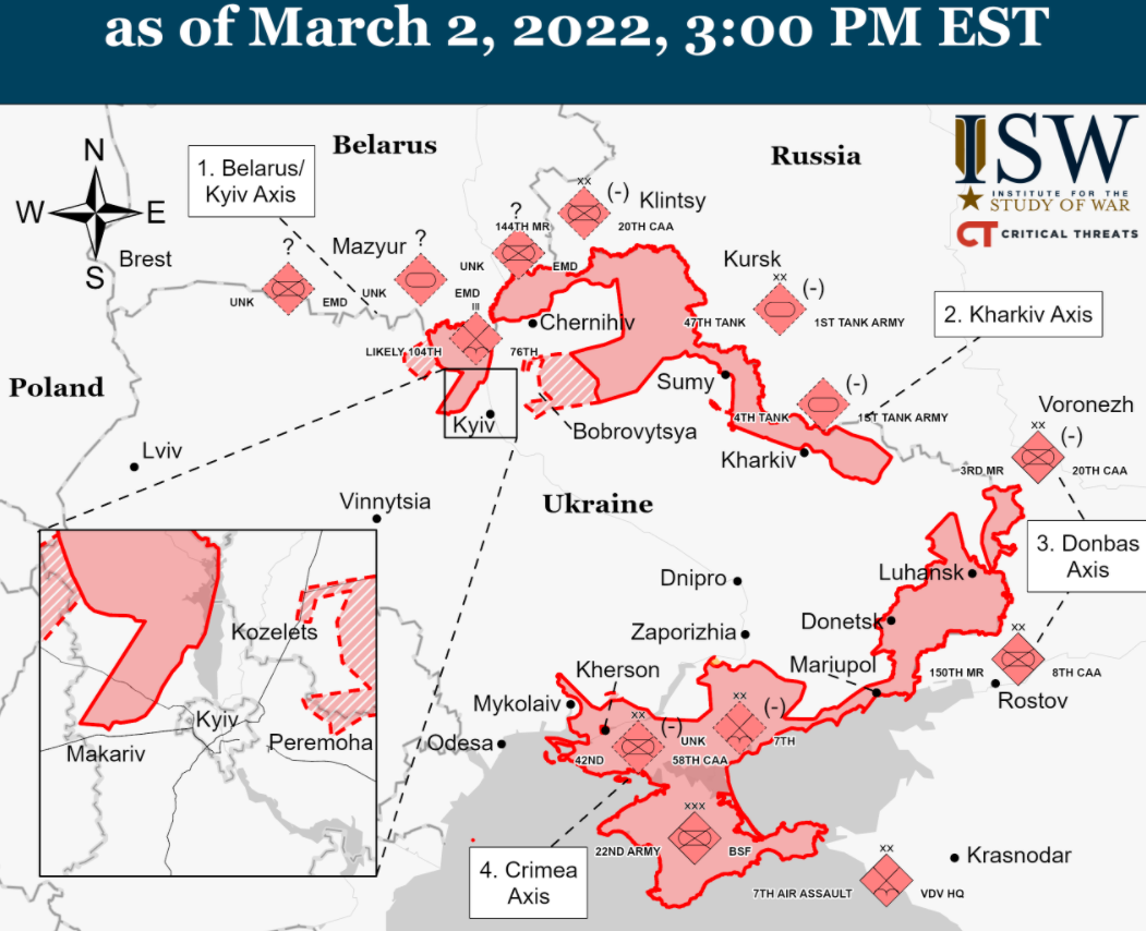 В Украине говорят, что ВСУ пошли в контрнаступление в Макарове к северу от трассы и сейчас контролируют населенный пункт. Также публиковали видео о том, как бойцы ВСУ вывешивают украинский флаг в Буче. Впрочем, мэр города позже сказал, что бои продолжаются и "кадыровцы" пытаются прорваться в город.