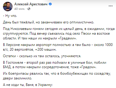 "День был тяжёлый, но заканчиваем его оптимистично. Под Николаевым гоняли сегодня их (российских солдат - Ред.) целый день, в ожидании, когда сгруппируются. Под вечер съехались под село Пески на востоке области. И там наши их накрыли "Градами". В Херсоне накрыли аэропорт полностью: а там было - около 1000 в/с, 20 вертолётов, +200 машин. Остатки - сколько их там осталось, уточняются. В Гостомеле - второй раз раз поймали в уличные бои, побили БМД, а потом накрыли сосредоточение, тоже "Градом"", - сообщил советник руководителя ОП.