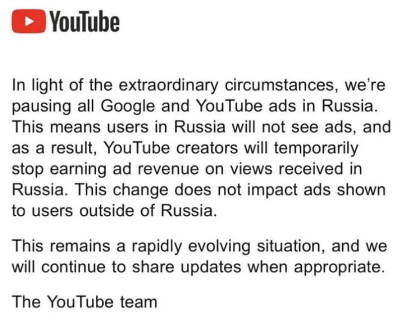 В YouTube заявили, что теперь российские пользователи не будут видеть рекламу, а значит их просмотры не монетизируются (за них не будут платить создателям контента).