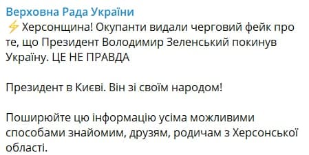 Тем временем пресс-служба Верховной Рады Украины сообщила о том, что президент находится в Киеве и призвали не верить фейковой информации, которую распространяет оккупант.