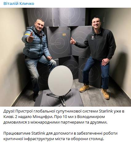 20:17 Мэр Кличко сделал фото с братом и написал пост о том, что интернет Маска "Старлинк" уже в Киеве. Работать будет для помощи критической инфраструктуры и обороны столицы.