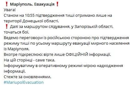 Губернатор области Кириленко сообщает, что пока подтвержден режим тишины только по Донецкой области. По маршруту эвакуации в Запорожской области ещё идут бои и продолжаются переговоры с российской стороной об их прекращении.