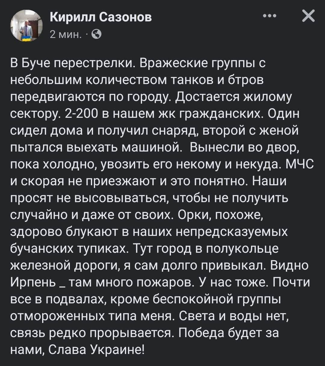 - в районе Бородянки противник ведет инженерные работы в рамках подготовки к наступлению. В Дымере создается укрепрайон РФ.