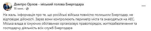 Однако по данным мэра Энергодара Дмитрия Орлова, российские войска сейчас они контролируют периметр города и находятся на Запорожской АЭС.