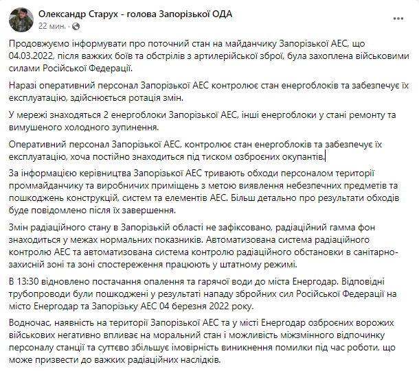 Как сообщил губернатор региона Александр Старух, наличие на территории Запорожской АЭС и в городе Энергодар вооруженных вражеских военных негативно влияет на моральное состояние и возможность межсменного отдыха персонала станции и существенно увеличивает вероятность возникновения ошибки во время работы. Все это может  привести к тяжелым радиационным последствиям.