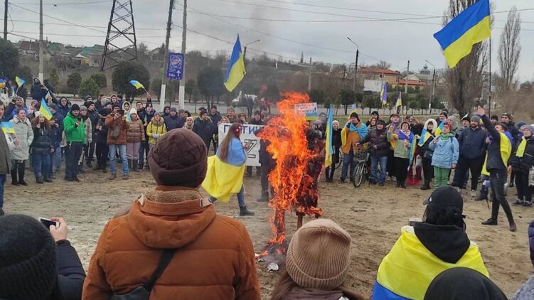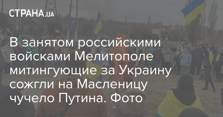 В занятом российскими войсками Мелитополе митингующие за Украину сожгли на Масленицу чучело Путина. Фото