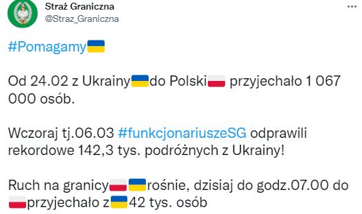 10.17 С 24 февраля из Украины в Польшу выехали 1 067 000 человек. Только 6 марта, польскую границу пересекли 142,3 тыс. украинцев, сообщает Пограничная служба Польши в Twitter.