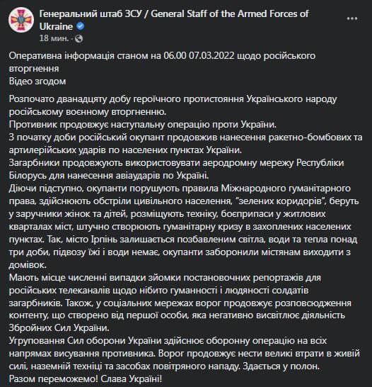 7 марта 2022 года идет двенадцатый день войны России в Украине.