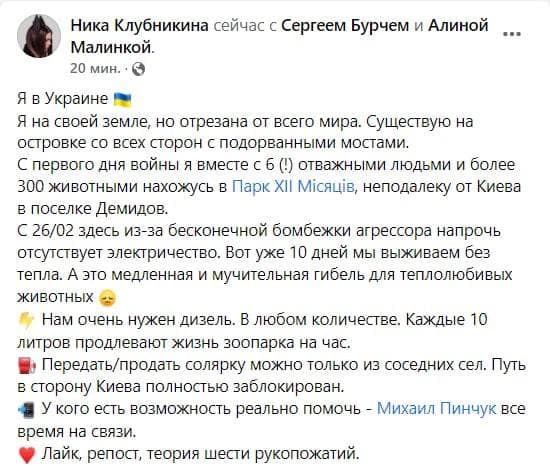 Автор поста в Facebook просит откликнуться всех, кто может помочь с дизельным топливом - ведь каждые 10 литров дизеля продлевают на час жизнь зоопарка.