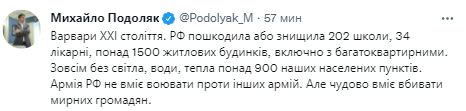 Россия повредила или уничтожила 202 школы, 34 больницы, более 1500 жилых домов, включая многоквартирные. Вместе с тем, без света, воды и тепла остаются более 900 населенных пунктов.