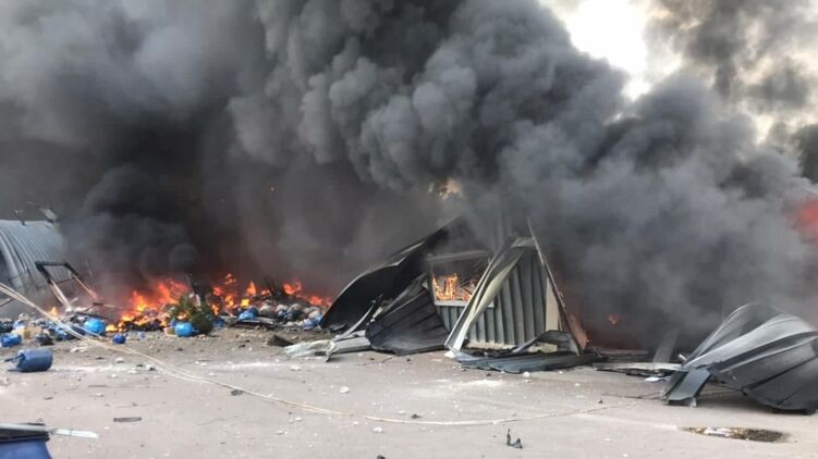 По данным ГСЧС, произошло разрушение двух складских зданий с последующим возгоранием на площади 2 тысяч квадратов.