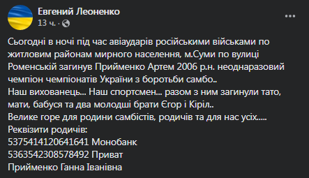 "Сегодня ночью во время авиаударов российскими войсками по жилым районам мирного населения в г. Сумы по улице Роменской погиб Прийменко Артем 2006 г.р. - неоднократный чемпион чемпионатов Украины по борьбе самбо", - написал Леоненко.