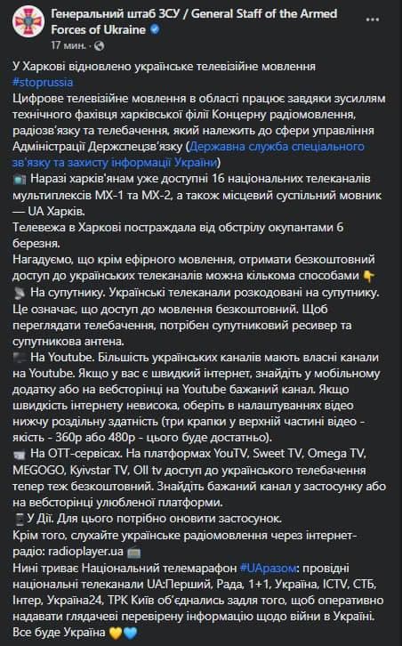 В сообщении говорится, что сейчас харьковчанам доступны 16 национальных телеканалов, вещание которых было нарушено после обстрела телебашни 6 марта.