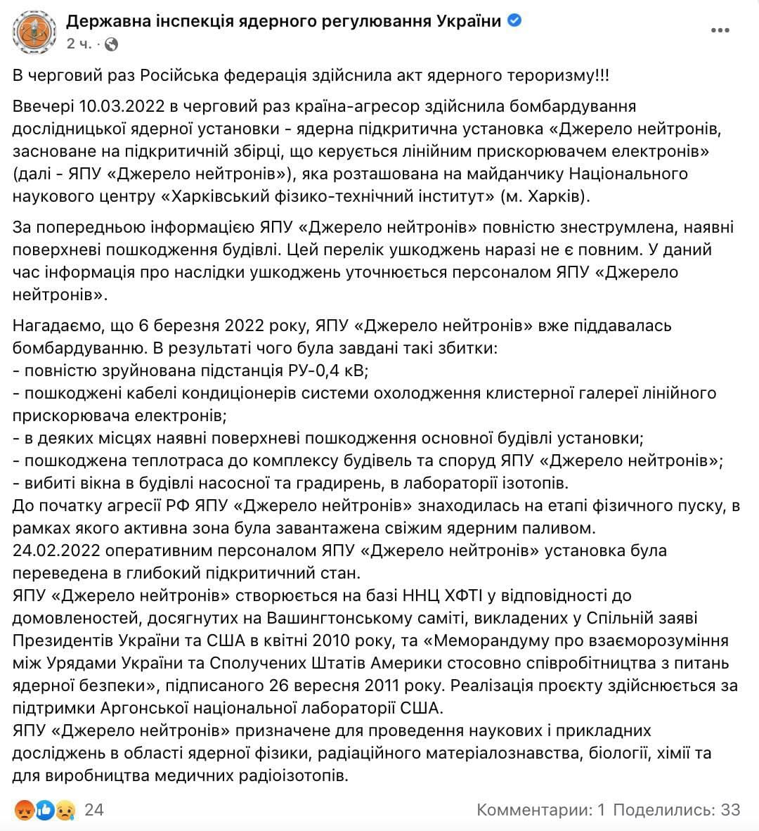 6 марта 2022 года, ЯПУ «Источник нейтронов» уже подвергалась бомбардировке.