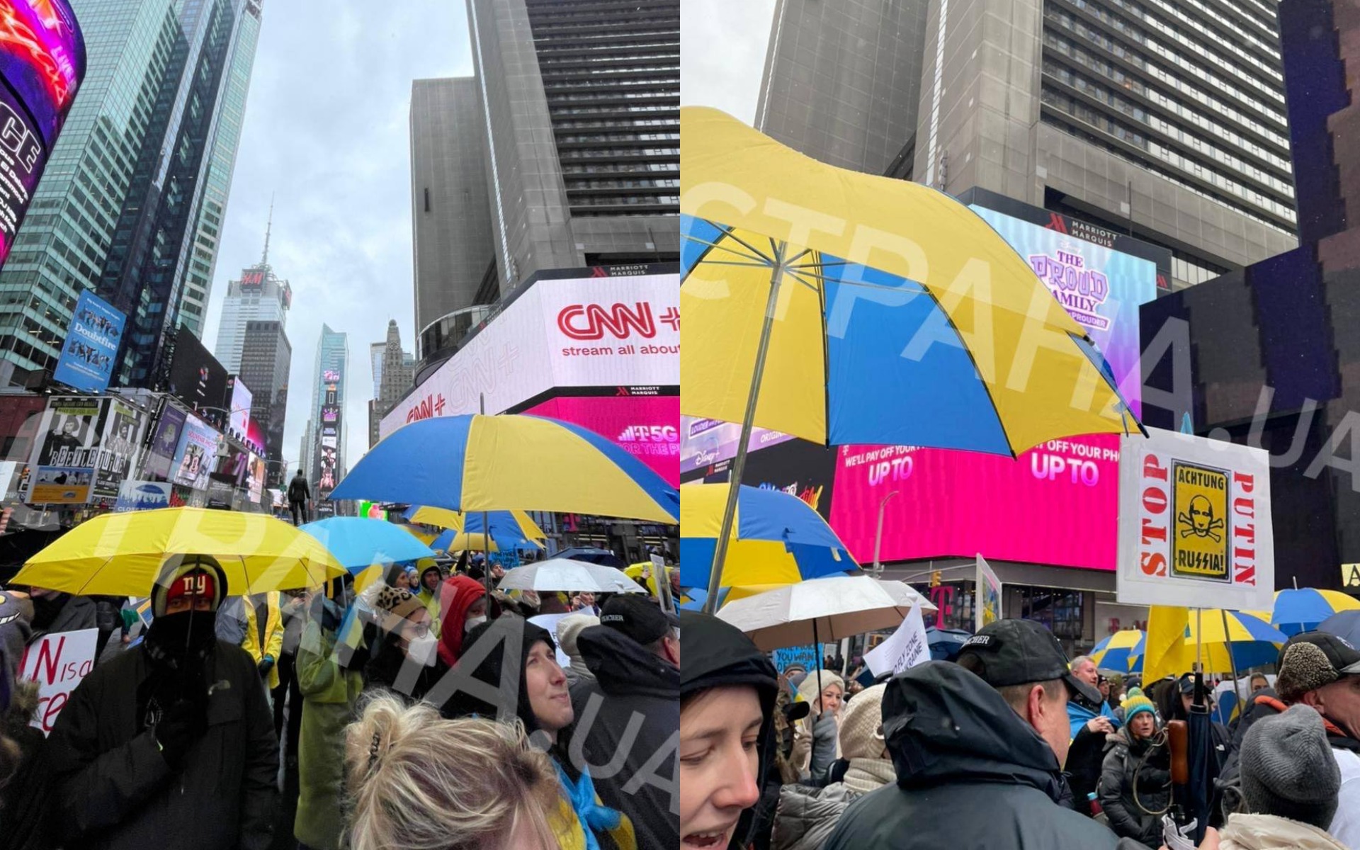 21.06 В Нью-Йорке на главной площади города Таймс Сквер чуть более получаса назад началась акция представителей украинской диаспоры и местного населения с призывом закрыть небо над Украиной. Символ акции - "закрывающие небо" желто-синие зонтики, которые принесли ее участники.