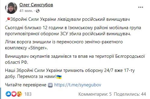 20.12 Харьковский губернатор заявляет, что ВСУ сбили Стингером российский истребитель под Изюмом. При этом заявляется, что он упал на территорию Белгородской области.