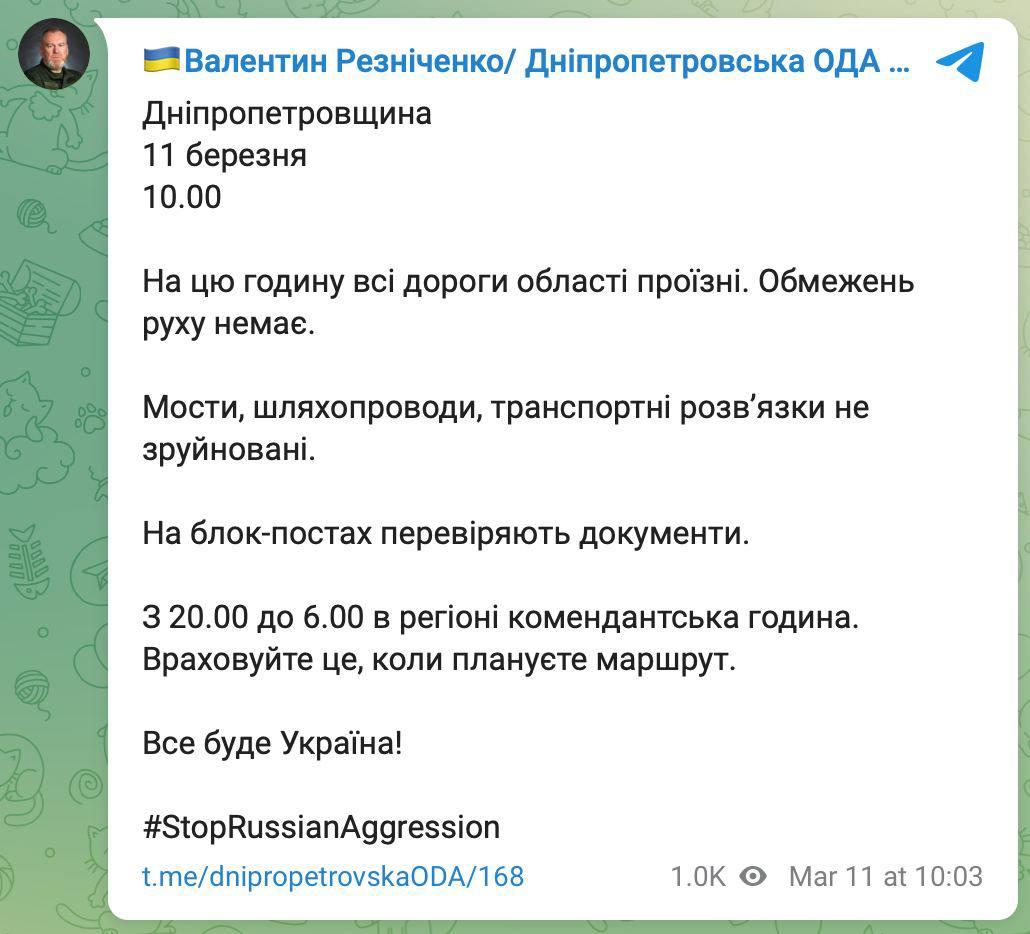 10.10 Ситуация на дорогах Днепропетровской области. Препятствий по движению и взорванных мостов нет. Но действует комендантский час с 8 вечера и до 6 утра.