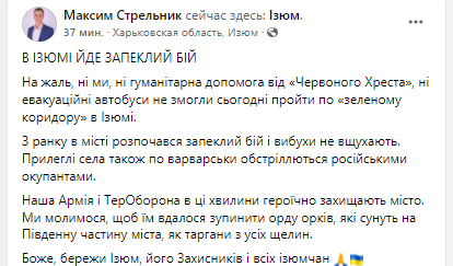 "К сожалению, ни мы, ни гуманитарная помощь от Красного Креста, ни эвакуационные автобусы не смогли сегодня пройти по зеленому коридору в Изюме. С утра в городе началось ожесточенное сражение и взрывы не утихают. Прилегающие деревни также по варварски обстреливаются русскими оккупантами.