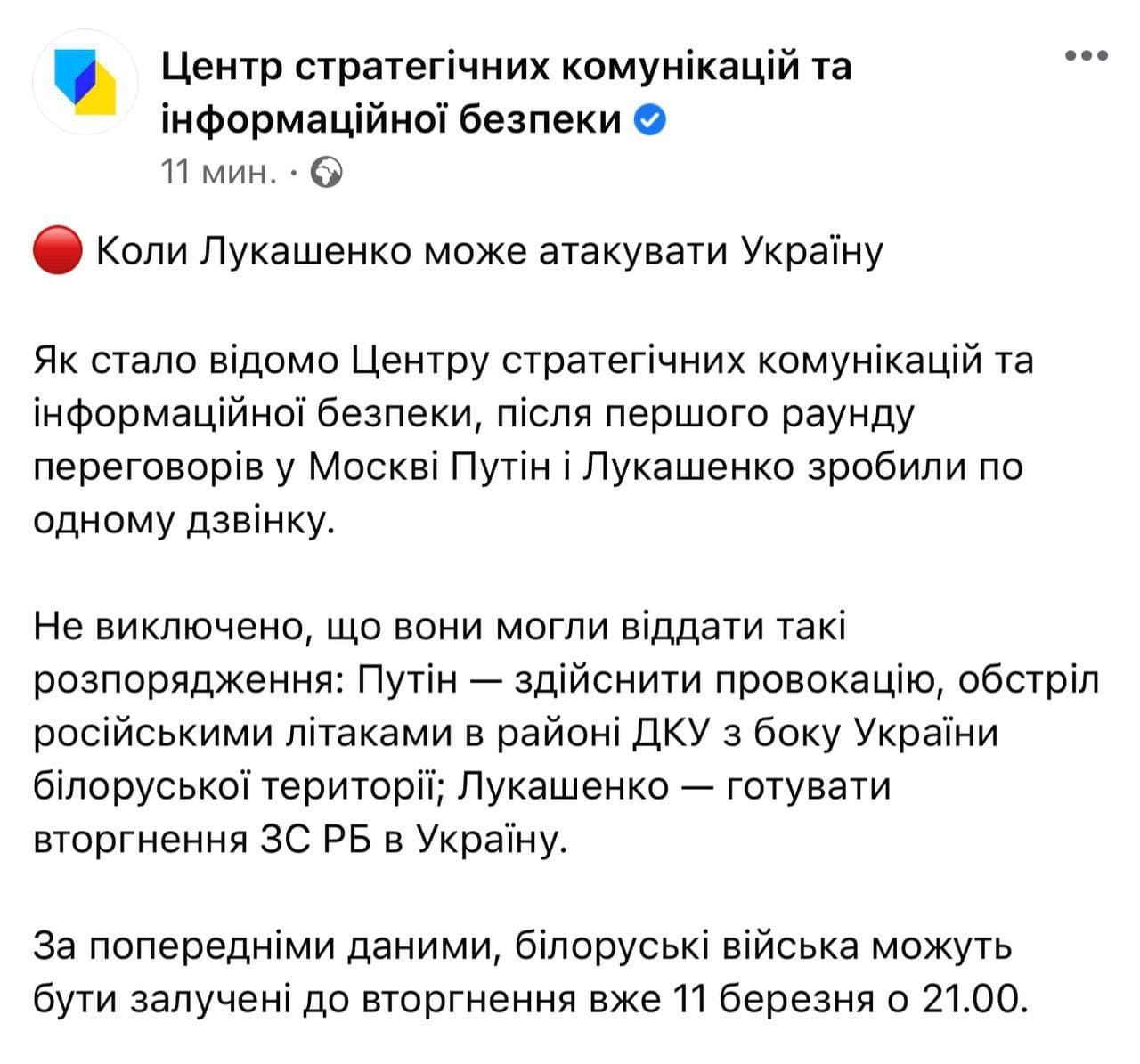 Центр стратегических коммуникаций и информационной безопасности заявляет, что по предварительным данным, белорусские войска могут быть привлечены к вторжению 11 марта в 21:00.