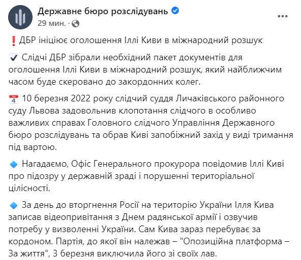 Госбюро расследований инициирует объявление народного депутата от партии ОПЖЗ Ильи Кивы в международный розыск. Об этом прес-служба ведомства сообщила на официальной странице Бюро в Facebook.