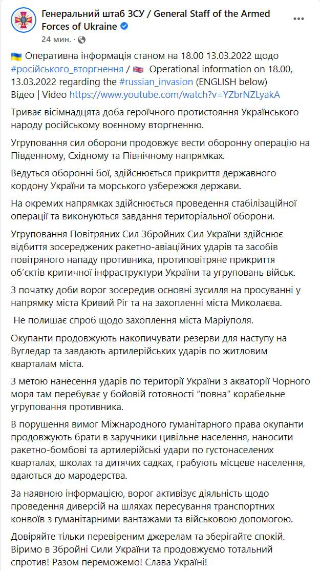 Российские оккупанты сосредоточили основные усилия на продвижении в направлении Кривого Рога и на попытках захватить Николаев. Об этом говорится в обновленной сводке Генштаба ВСУ по состоянию на 18:00 воскресенья, 13 марта.