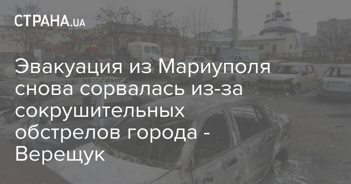 Вице-премьер Ирина Верещук в комментарии "Стране" сообщила, что эвакуация из Мариуполя снова сорвалась. При этом, сегодня удалось эвакуировать около семи тысяч человек из Луганской и Киевской областей.