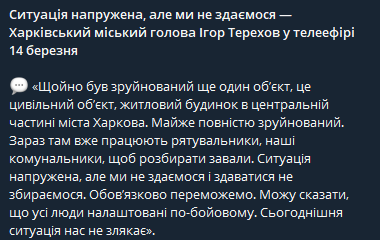 В понедельник, 14 марта, очередной удар нанесён по центральной части Харькова. В результате авиаудара разрушен четырехэтажный жилой дом.
