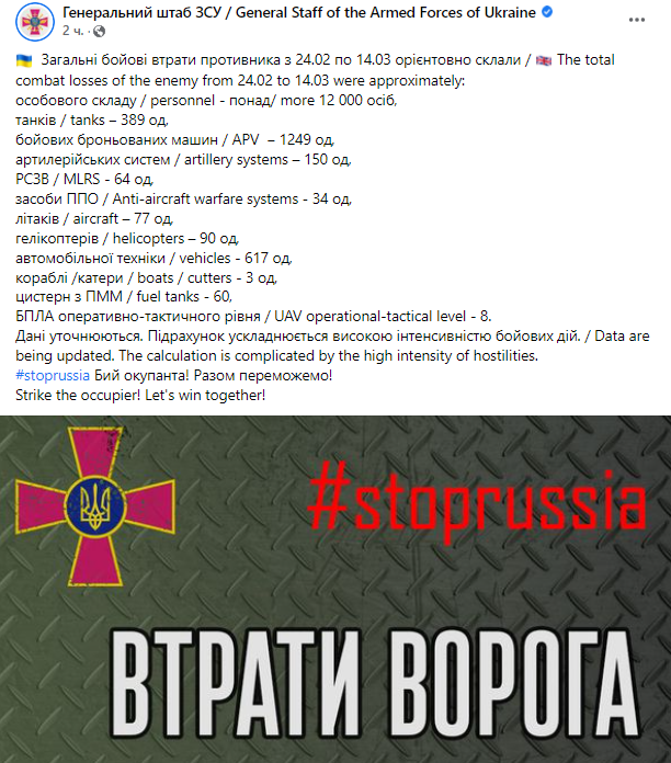 Генштаб ВСУ обновил данные о боевых потерях российских оккупантов за 18 дней войны по состоянию на утро 14 марта.