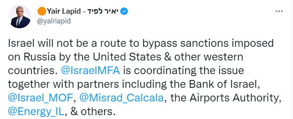 Министр иностранных дел Израиля Яир Лапид заявил, что Израиль не будет помогать России обходить санкции Запада.