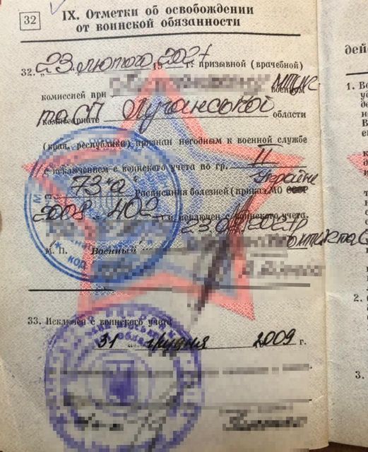"В документе 53-летнего мужчины говорится, что его сняли с военного учета в 2009 году, но причина снятия была датирована прошлым годом. В частности, утверждается, что комиссия городского территориального центра компиляции и социальной поддержки Луганской области признала мужчину непригодным к военной службе по ст. 73 приказ МО Украины No 402 от 14.08.2008 (Беременность, роды и послеродовой период, их последствия)", - говорится в сообщении.