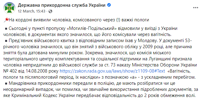На пункте пропуска "Могилев-Подольский" Госпогранслужба Украины задержала 53-летнего мужчину, у которого комиссовали сложные роды в 2009 году. Путешественник пытался пересечь границу, однако вместо этого его направили в отделение полиции.