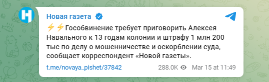 Российское гособвинение требует приговорить российского оппозиционера Алексея Навального, который сейчас находится в тюрьме, к 13 годам колонии и штрафу 1 миллион 200 тысяч рублей по делу о "мошенничестве и оскорблении суда".