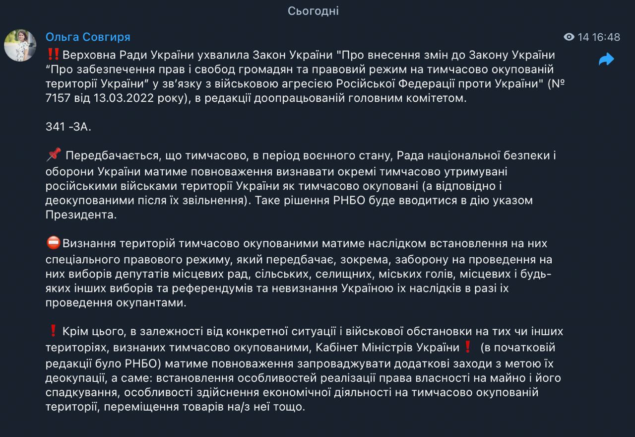 "Признание территорий временно оккупированными будет следствием установления на них специального правового режима, предусматривающего, в частности, запрет на проведение на них выборов депутатов местных советов, сельских, поселковых, городских председателей, местных и любых других выборов и референдумов и непризнание Украиной их последствий в случае их проведения оккупантами", - говорится в сообщении.